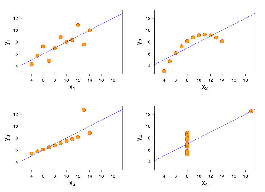 Anscombe's quartet comprises four data sets. Each dataset consists of eleven (x,y) points.Datasaurus dataset was initially created by Alberto Cairo. It is composed of 142 observations with a bivariate normal distribution.diamonds data